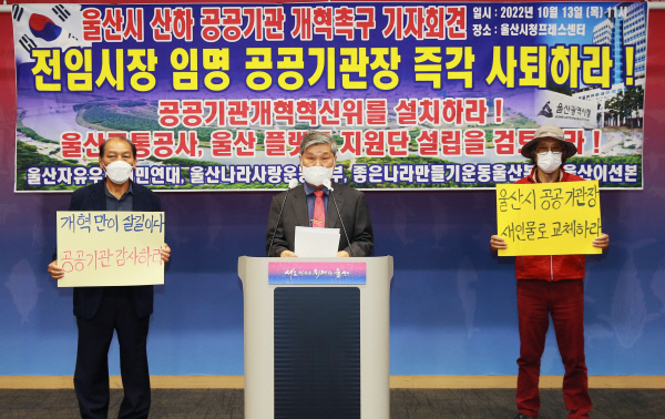 울산자유우파시민연대 외 3단체는 13일 울산시청 프레스센터에서 울산시 산하 공공기관 개혁을 촉구하는 기자회견을 가졌다. 우성만 기자 울산자유우파시민연대 외 3단체는 13일 울산시청 프레스센터에서 울산시 산하 공공기관 개혁을 촉구하는 기자회견을 가졌다. 우성만 기자