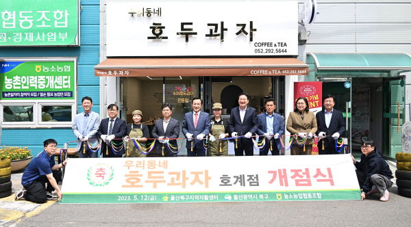 울산북구지역자활센터는 신규 자활사업으로 지난 12일 북구 호계동에 '우리동네 호두과자'를 개업했다. 박천동 북구청장과 자활사업 참여자들이 개업 축하 테이프를 자르고 있다.윤병집 기자 sini20000kr@naver.com