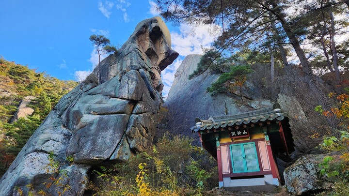 관음사 뒤편으로 고개를 돌리면, ‘큰곰바위’ 라 불리는 거대한 바위가 하늘을 떠받치듯 서 있다. 높이 10m에 이르는 이 바위는 보는 각도에 따라 사자처럼도, 곰이 앞발을 들고 선 형상처럼도 보인다. 바로 그 바위 아래, 관음사는 마치 자연의 보호 아래 자리한 은신처처럼 장엄하게 앉아 있다.