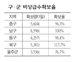 이와 함께 민방위 비상급수시설의 경우 급수인구 1인당 1일 25ℓ를 정해져 있지만 북구를 제외한 나머지 구·군은 모두 확보량이 부족한 것으로 나타났다.