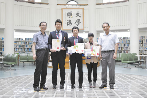 ▲ 신라대학교(총장 박태학) 학생 발명동아리 E.P.C.P. 소속 조윤혁(자동차기계공학과 4년), 김상길(자동차기계공학과 3년), 이은정(전자공학과 1년)씨 등 학생 3명이 최근 마카오 워프 컨벤션센터에서 열린 ‘2013 마카오 국제혁신발명품전시회’에서 세계 18개국 1,200여명과 기량을 겨뤄 금상을 차지하는 쾌거를 이뤘다.