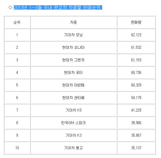 한편 상반기 베스트셀링카 2위에 올랐던 소형트럭 포터는 8월 누적으로 6만736대가 판매되며 4위로 물러섰으나 하반기 사륜구동(4WD) 신모델을 선보이며 여전히 상위권 진입을 노리고 있다.