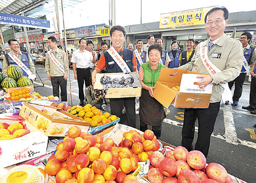 윤갑한 현대차 사장과 문용문 현대차노조 지부장은 12일 오전 11시 중구 학성동 (구)역전시장을 함께 찾아 전통시장 상품권으로 과일과 생선, 건어물 등 추석 물품을 직접 구입하며 상인들을 격려했다.