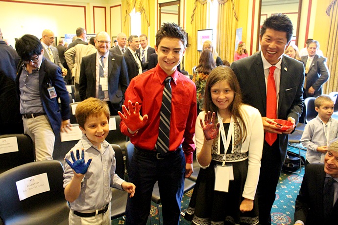 ▲ 19일(현지시간) 미국 연방의회 의사당에서 열린 현대차의 소아암 치료지원 프로그램 '호프 온 휠스'(hope On Wheels·바퀴에 희망을 싣고) 행사에서 현대차의 후원으로 소아암을 이겨낸 청소년, 어린이들이 핸드프린팅에 앞서 기념 촬영을 하고 있다. 연합뉴스 www.yonhapnews.co.kr