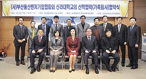▲ 신라대학교(총장 박태학)와 부산울산벤처기업협회(회장 김경조)는 지난 11일 오전 신라대 종합정보센터 회의실에서 산학협력(가족회사) 협약식을 가졌다. 양 기관은 앞으로 다양한 교류 프로그램을 통해 CEO강좌, 창업교육, 취업교육, 인턴십 등을 활성화, 상호 발전을 도모해 나가기로 했다.
