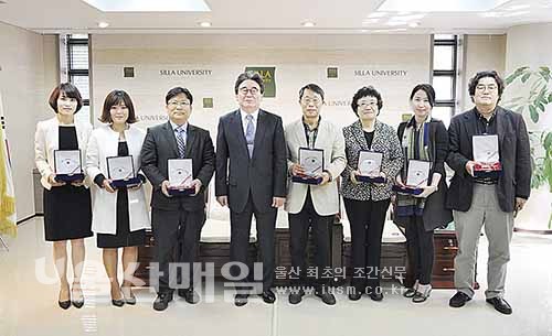 ▲ 신라대학교는 최근 박태학 총장을 비롯한 보직자들이 참석한 가운데 2013학년도 베스트 티처상(Best Teacher Awards) 시상식을 가졌다. 이번 시상식에서는 본상 5명, e러닝상 1명, 수업발전노력상 1명 등 모두 7명의 교수가 총장 명의의 상패와 상금을 받았다.