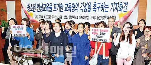 ▲ 울산좋은학교만들기학부모연대(대표 박영춘)는 지난 30일 시의회 프레스센터에서 청소년 인성교육을 포기한 울산시교육청의 각성을 촉구하는 기자회견을 가졌다. 김정훈 기자 idacoya@iusm.co.kr