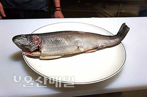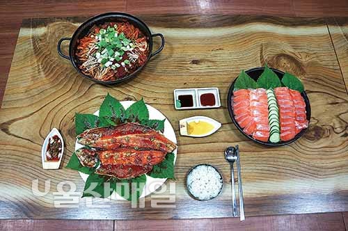 ▲ 남구 삼산동 송어요리 음식점 ‘바다송어’의 코스요리. 위에서부터 시계방향으로 시래기찜, 송어회, 송어구이. 신선도 유지를 위해 매일 소량 주문하기 때문에 예약을 해야만 맛볼 수 있다.