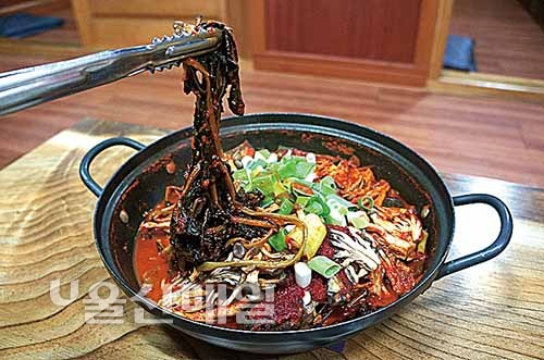 ▲ 부산, 울산 정자에서 공수해 온 생우럭이 들어간 시래기찜. 3개월간 건조시킨 무청시래기를 직접 손질해 사용한다.