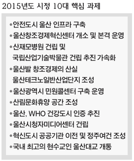 2015년 시정 10대 과제는 △안전도시 울산 인프라 구축 △울산창조경제혁신센터 개소 및 본격 운영 △산재모병원 건립 및 국립산업기술박물관 건립 추진 가속화 △울산발 창조경제의 산실 울산테크노일반산업단지 조성 △울산광역시 민원콜센터 구축 운영 △산림휴양문화 공간 조성 △울산, WHO 건강도시 인증 추진 △울산시청자미디어센터 건립 △혁신도시 공공기관 이전 및 정주여건 조성 △국내 최고의 현수교인 울산대교 개통 등이다.