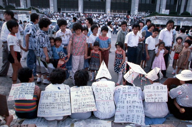 ▲ 1945년 광복과 함께 우리 말과 노래도 해방되자 대중문화는 척박한 땅에서 꽃을 피웠다. 70년을 담금질한 대중문화는 지금 세계인을 사로잡는 한류의 첨병으로 K-웨이브를 이끌고 있다. 1970~80년대는 대중문화계의 빛과 그림자가 뚜렷했다. 1981년 컬러TV 방송이 시작되면서 본격적으로 TV 전성시대가 열렸다. 1983년 KBS '이산가족 찾기'가 안방극장을 눈물로 바다로 만들었다. 사진은 KBS 본관 앞에서 가족들의 인적사항을 적은 표지를 몸에 붙이고 앉아있는 이산가족들. << 연합뉴스 자료사진 >>