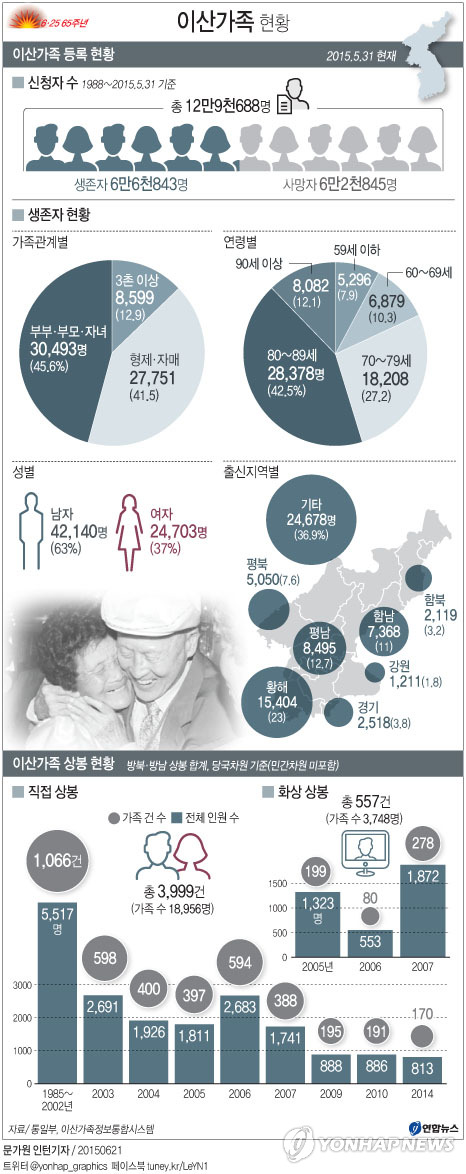 이산가족 중 절반가량인 6만2천845명은 이미 숨져 생존자는 6만6천843명에 불과하다.