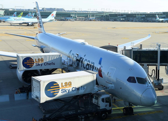 프리미엄 이코노미석을 겸비한 아메리칸 항공의 보잉 787-9 드림라이너 항공기가 인천 국제공항에서 댈러스/포트워스로 출발하는 승객들을 태우기 위해 준비하고 있다. 아메리칸 항공은 이미 미국의 국제선 운항 항공사 가운데 보유 항공기의 평균 기령이 가장 낮으며, 현대화 작업과 연비 효율 개선을 통해 고객들이 현대적인 아메리칸 항공을 경험할 수 있도록 지속적으로 노력하고 있다. [아메리칸 항공 제공=연합뉴스]