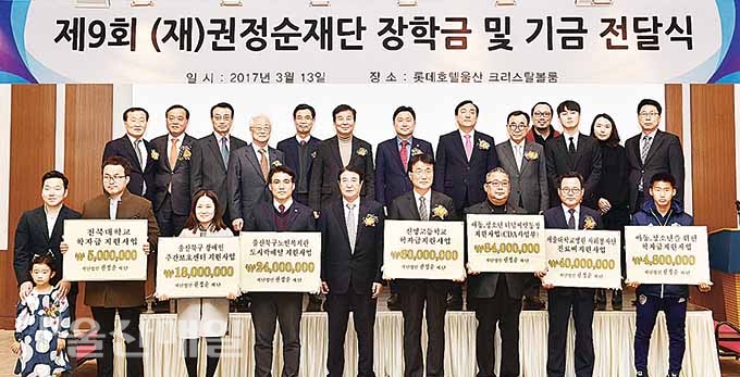 (재)권정순재단(이사장 이문희)은 13일 오후 롯데호텔울산에서 열린 ‘제9회 장학금 및 기금 전달식'을 열고 장학금, 소외계층 생활비 및 무료급식소 사업비 등 총 2억 8,580만원을 지원했다.