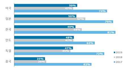 일본 역시 2017년 79%, 작년 57%, 올해 50% 등으로 소비자 신뢰가 정체되는 모습을 보였다.