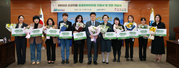 울산시는 11일 울산시청 상황실에서 서정욱 행정부시장, 김시화 울산공공형어린이집연합회장, 신규 지정 어린이집 대표 및 공공형어린이집연합회 임원진 등이 참석한 가운데 ‘2022년 신규 지정 공공형 어린이집 지정서 및 현판 전달식’을 갖고 기념 촬영을 하고 있다. 울산시는 11일 울산시청 상황실에서 서정욱 행정부시장, 김시화 울산공공형어린이집연합회장, 신규 지정 어린이집 대표 및 공공형어린이집연합회 임원진 등이 참석한 가운데 ‘2022년 신규 지정 공공형 어린이집 지정서 및 현판 전달식’을 갖고 기념 촬영을 하고 있다.